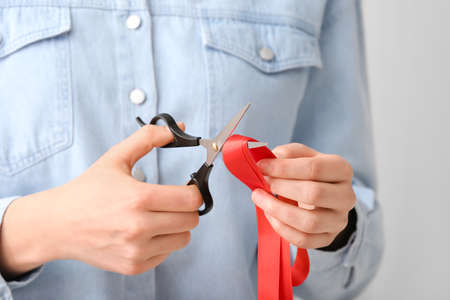 Woman cutting red ribbon, closeup