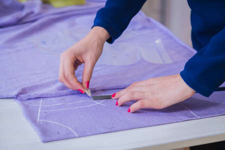 Workplace of seamstress. Hands doing sewing patterns with fabric