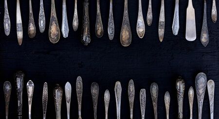 Lot of metal cutlery on a black background. Selective focus. Shallow depth of field. Toned.