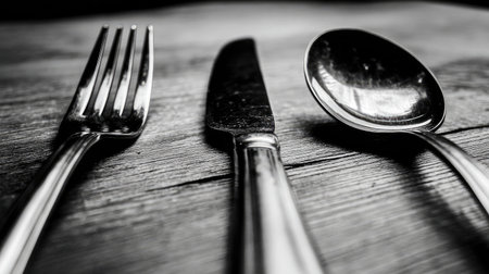 This striking monochrome image features a beautifully arranged set of silver cutlery, including a fork, knife, and spoon, on a rustic wooden surface.