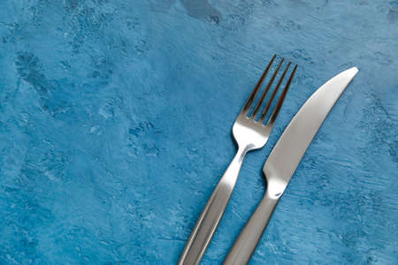 SStylish blue silver fork on yellow background. Close-up. High quality photo
