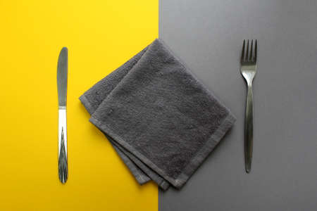 Close-up and selective focus of the set of dinning cutlery on a yellow background. Flat lay and top view of a spoon, fork, and knife with copy space.