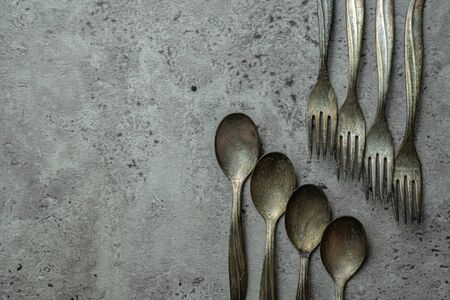 Vintage cutlery - spoons, forks and knives on an old wooden background. Selective focus.