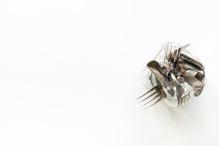 gray metal forks and spoons lie in a white wet plate on a brown table