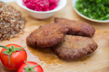 Meat cutlets on a wooden skewer . Meat cutlets, baked buckwheat on a wooden board . Red cabbage sauerkraut . Garlic, Onion, Tomatoes. Chopped coriander. Homemade cutlets with oatmeal on a wooden table