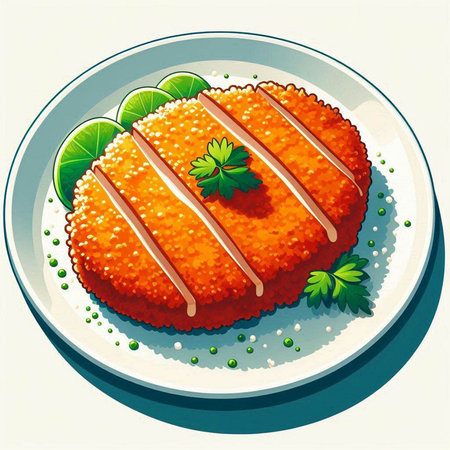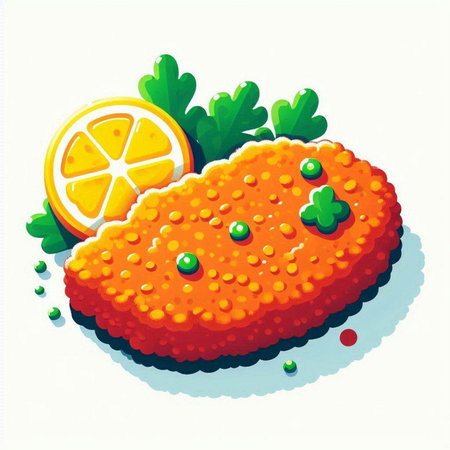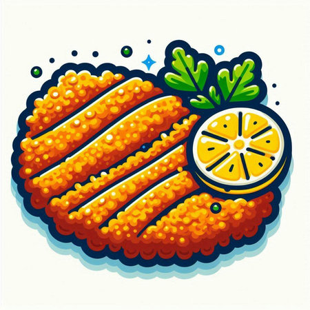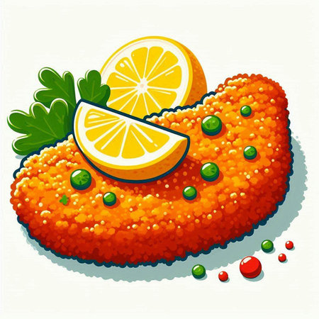 Illustration of a cutlet with lemon and parsley on a white background