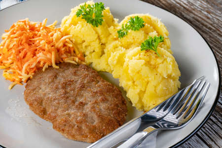 Homemade minced meat cutlet served with mashed potatoes and carrot salad.