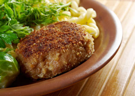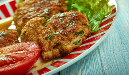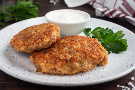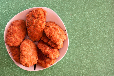 Fried minced cutlets served in a pile on a plate, typical eastern european homemade food, tasty dish