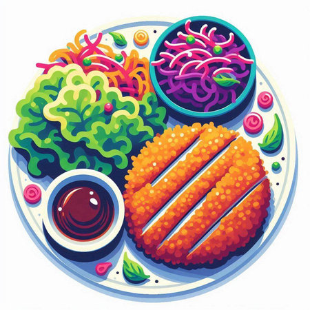 Fried pork cutlet with vegetable salad and soy sauce. Vector illustration