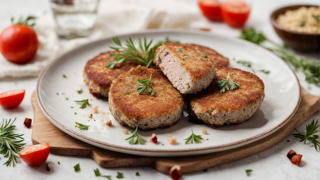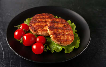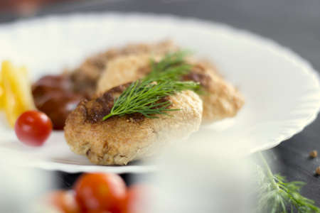 tasty fried meat cutlets decorated with vegetables and herbs