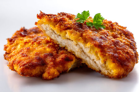 Golden breaded pork schnitzel, one cut in half, garnished with fresh parsley