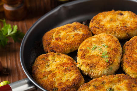 Pile of raw fish burgers on the kitchen wooden board.