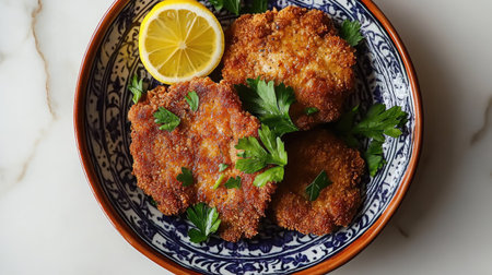 Enjoy a delightful serving of crispy fried cutlets garnished with fresh lemon and herbs, perfect for any meal or special occasion.