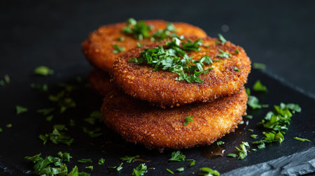 An enticing close-up of crispy Cotoletta alla Milanese garnished with fresh herbs. Perfect for showcasing delicious Italian cuisine and culinary artistry.