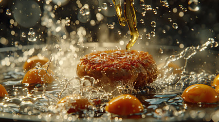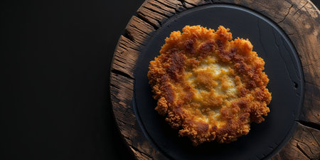 AI Generated. A black background image of a fried cutlet placed on a wooden board