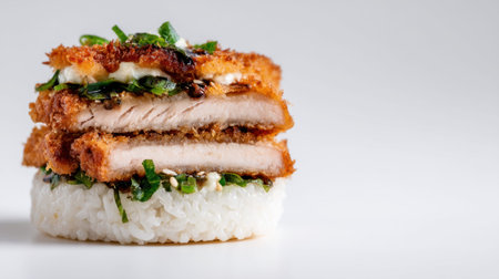 Indulge in the visual appeal of this layered fried chicken dish served on a bed of rice, enhanced with fresh green toppings, ideal for enchanting food photography.