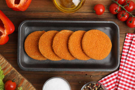 Uncooked breaded cutlets on wooden table, flat lay. Freshly frozen semi-finished product