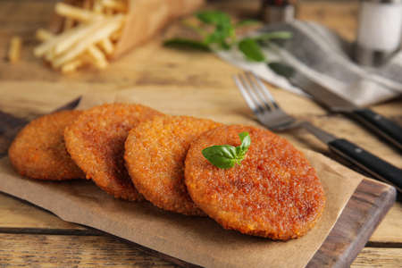 Delicious fried breaded cutlets with basil on wooden table