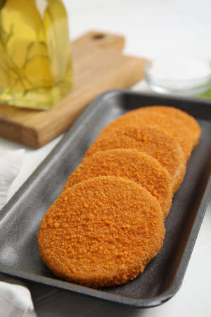 Uncooked breaded cutlets on white wooden table. Freshly frozen semi-finished product