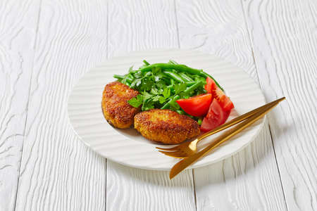 cornmeal crusted minced beef patties served with blanched green beans and fresh tomatoes on a white plate on a white wooden table, landscape view from above