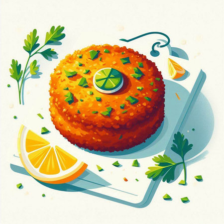 Illustration of a fish cutlet garnished with lime and parsley