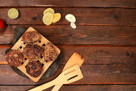 Homemade cutlets with onions, tomatoes and garlic, spicy herbs