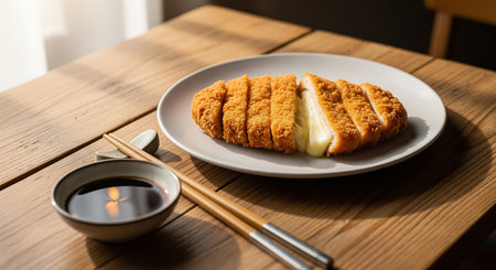Cheese Donkatsu on Wooden Table with Soy Sauce