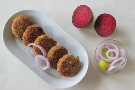 Air fried beetroot cutlets. Served with onions. Shot on white background