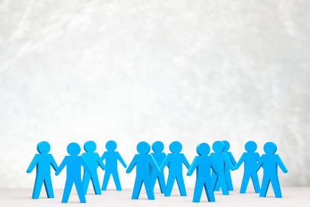 Wooden figures on blue background as a symbol of team building. Organization group people in business. Cooperation and partnership.