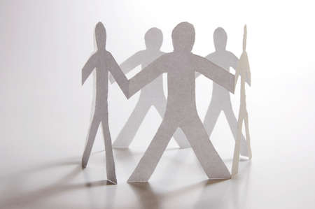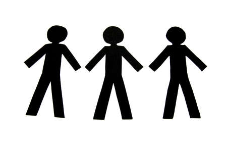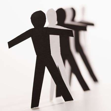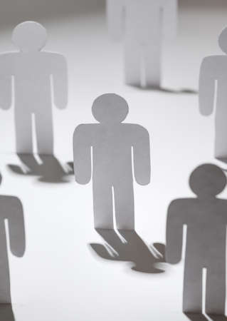 Close up of group of paper-men standing in a row. Lots of copies of one paper man, isolated on white
