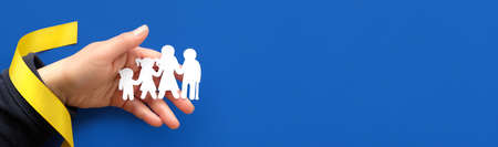 Helping hand holding Ukrainian family, white paper silhouette. Flat lay, top view on blue. Volunteer help to refugees from Ukraine. Copy-space, place for text.