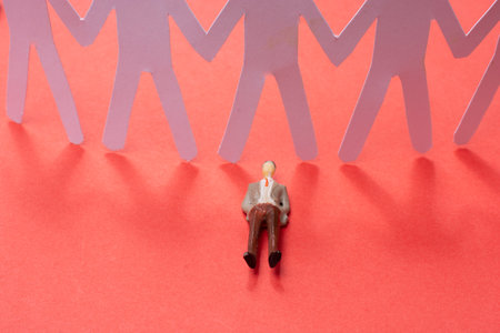 Hand place a paper human doll away from the group, unique person or social distancing in virus prevention concept