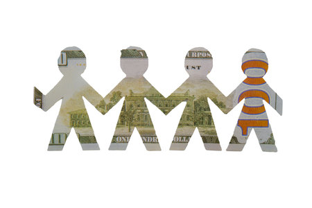 Hundred dollar bills cut out into paper dolls with hands linked together, isolated on white background