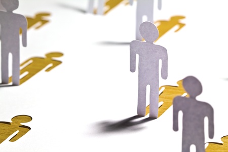 Small group of separated people seen from above represented anonymous with wooden figures on white background.