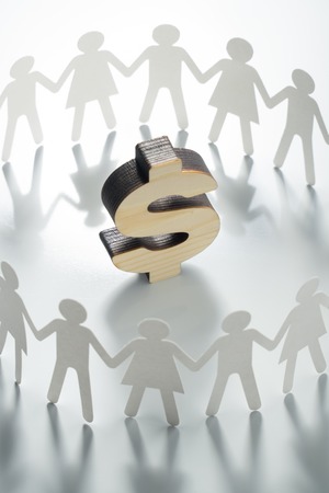 Circle of paper people holding hands in front of big dollar sign. Consumerism, economy concept.