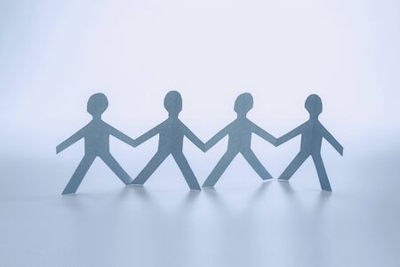 Close up of group of standing papermen, isolated on white background. Lots of copies of one paper man. Concept of teamwork, partnership and support