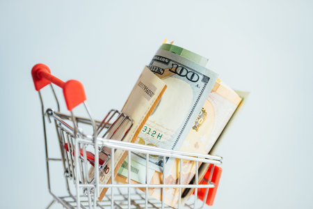 Rolled up banknotes of money. American dollars in a shopping cart.
