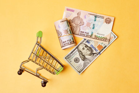 Buying us dollars in Uzbekistan. US dollars roll in shopping trolley and pile of Uzbek sums. Uzbek money and us dollar money exchange