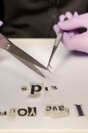 Criminal in hooded shirt preparing ransom letter from newspaper