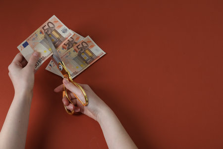 Woman cutting euro banknotes on brown background, top view. Space for text