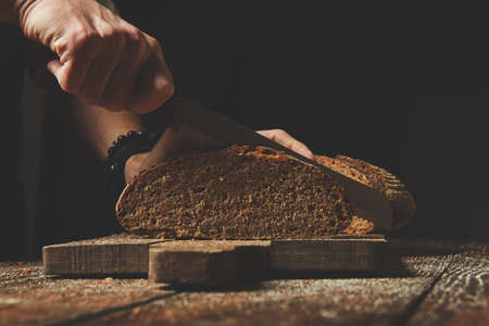 Close-up of chef's hands cutting whole grain bread with a knife on a wooden table. Concept of healthy eating and traditional bakery. Selective focus