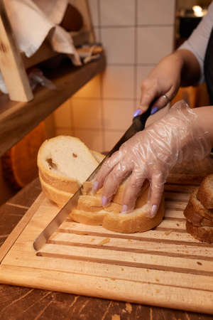 Close up of woman cutting bread in slices on wooden board