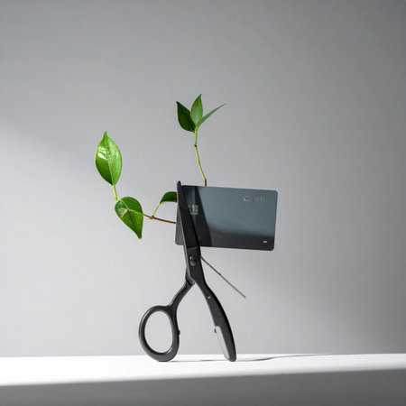 A surreal still life composition where a plant, symbolizing new growth and opportunity, sprouts from a credit card.