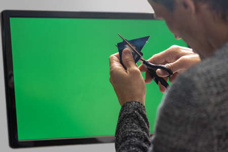 Cutting up a credit card with scissors. Demonstrating either paid off or bankrupt and the card is no good any more.