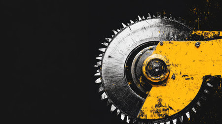 industrial tool in wood and metal factory, compound mitre saw with sharp, circular blade