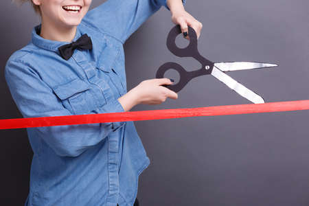 A young woman with big paper scissors and red ribbon on a gray background. A concept of objects for work with documents.