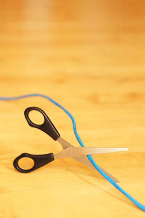 Steel scissors cut the yellow network cable connector.Internet censorship