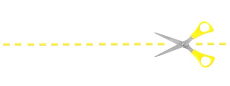 Scissors that cut yellow notepad with text on a blue background. Spending concept