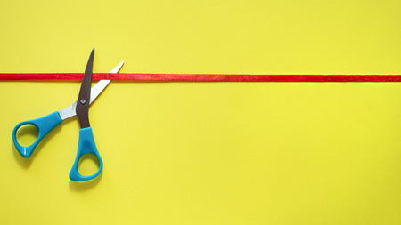 Grand opening. Scissors cut the red ribbon on yellow background, top view. grand opening idea, sign, symbol, concept