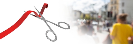 Grand Opening illustrated with scissors and a blue ribbon on a gray background